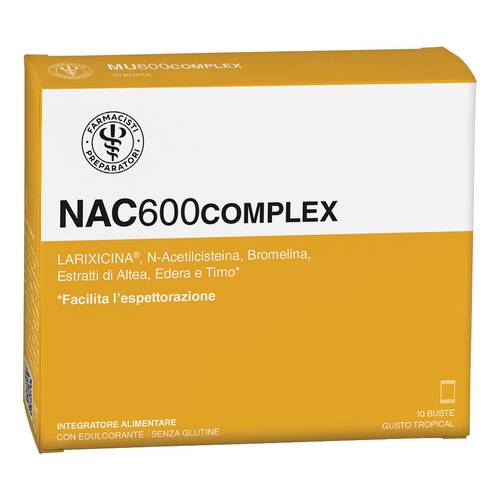 NAC600COMPLEXDescrizione Integratore alimentare a base di estratto di larice larixicina, N-acetilcisteina, vitamina C, zinco, bromelina, estratti di altea, edera e timo. Con edulcorante. Il larice e l’altea contribuiscono alla funzionalità delle mucose dell’apparato respiratorio, l’altea inoltre esercita un’azione emolliente e lenitiva. Lo zinco e la vitamina C contribuiscono alla normale funzione del sistema immunitario e alla protezione delle cellule dallo stress ossidativo. L’edera è utile per favorire la fluidità delle secrezioni bronchiali. Il timo facilita l’espettorazione. Ingredienti Maltodestrine, N-acetilcisteina...
